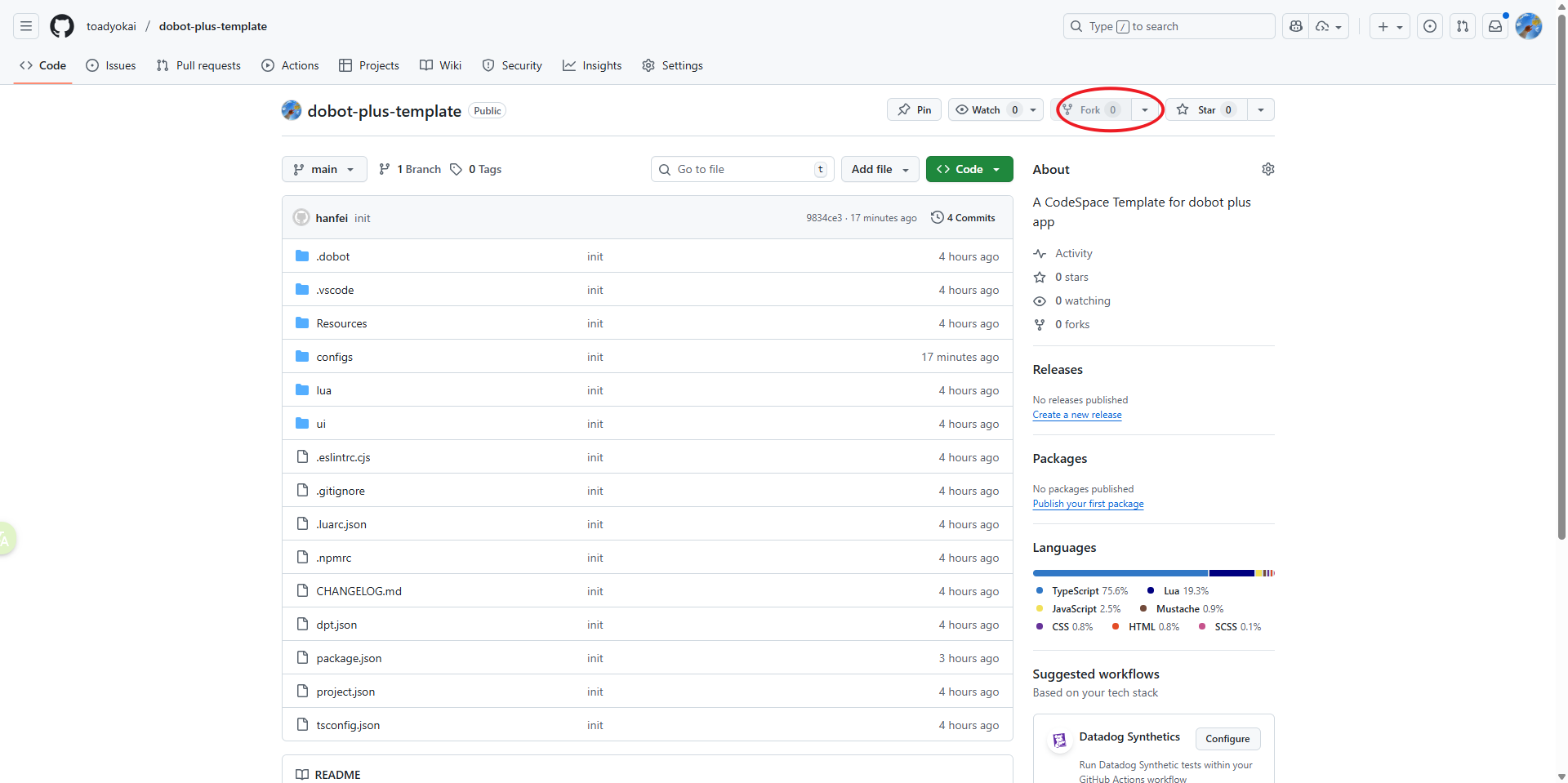 Developers can fork the template repository to their own repository, or manually download the Dobot+ plugin template, create a repository locally, and push it to GitHub.