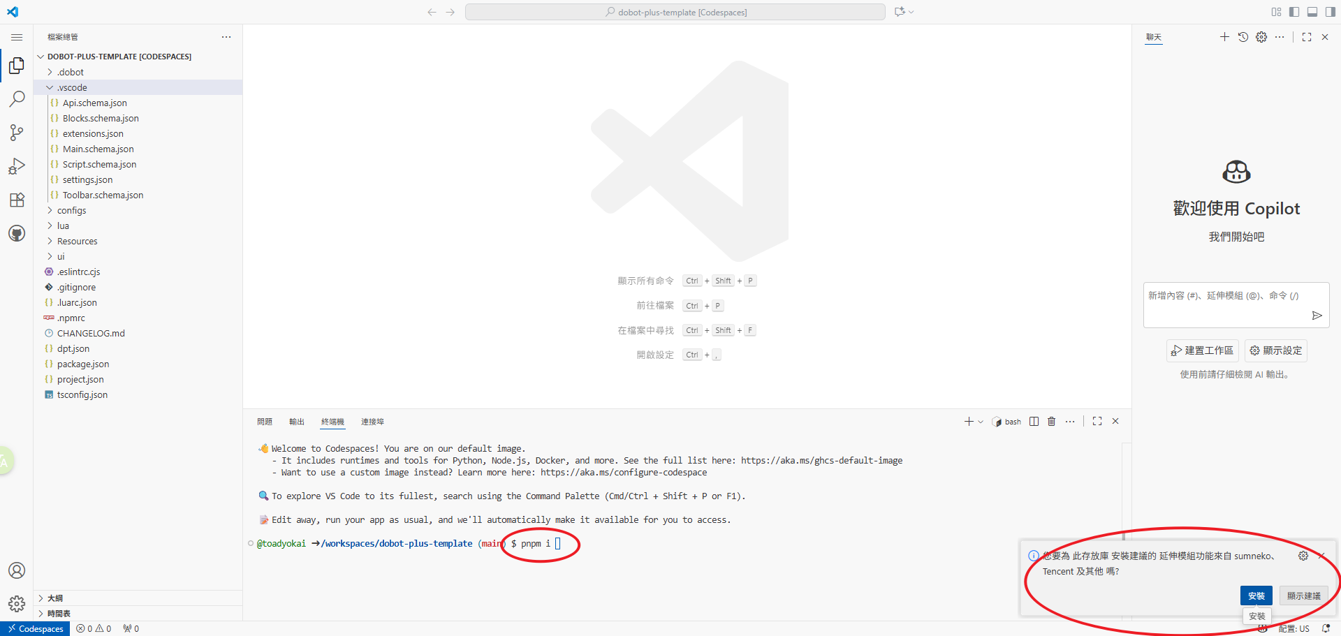 When entering for the first time, a pop-up in the lower right corner will recommend VS Code extensions for the Dobot+ template project. These extensions are helpful for improving development efficiency and are recommended for installation.